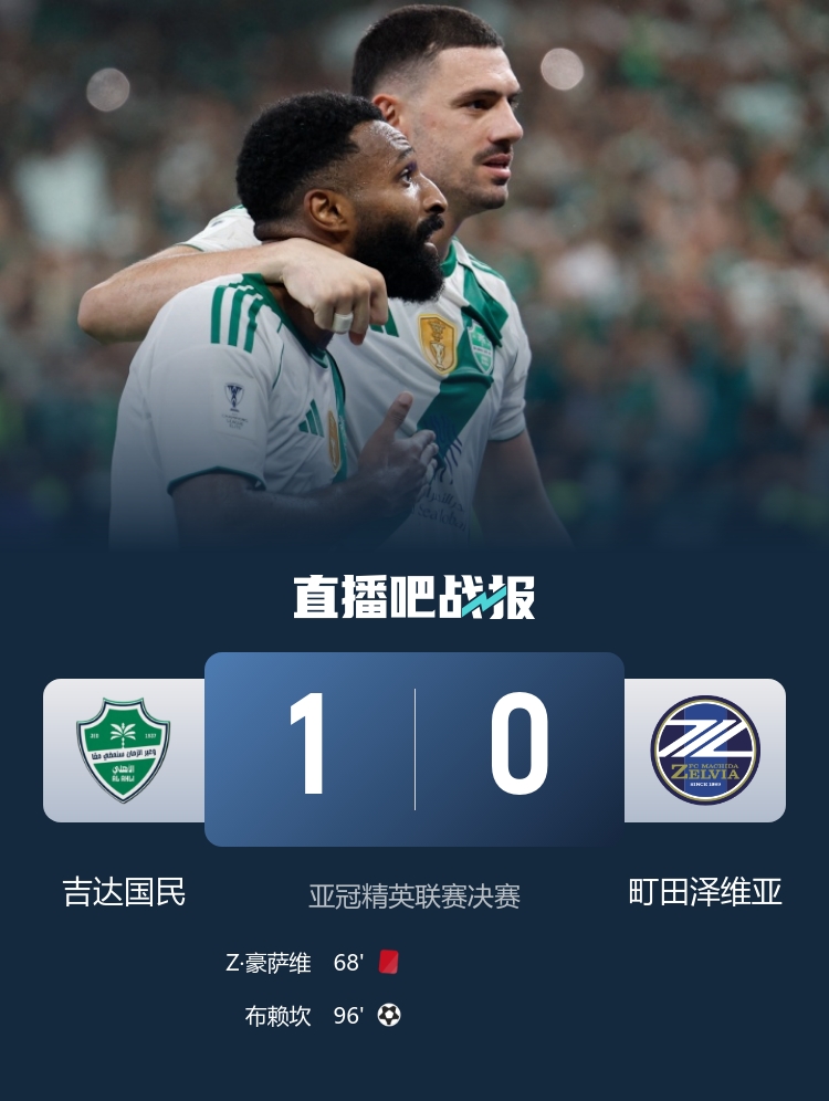 十人吉达国民加时1-0町田泽维亚,连续2年夺亚冠精英联赛冠军;马宁担任比赛四官。