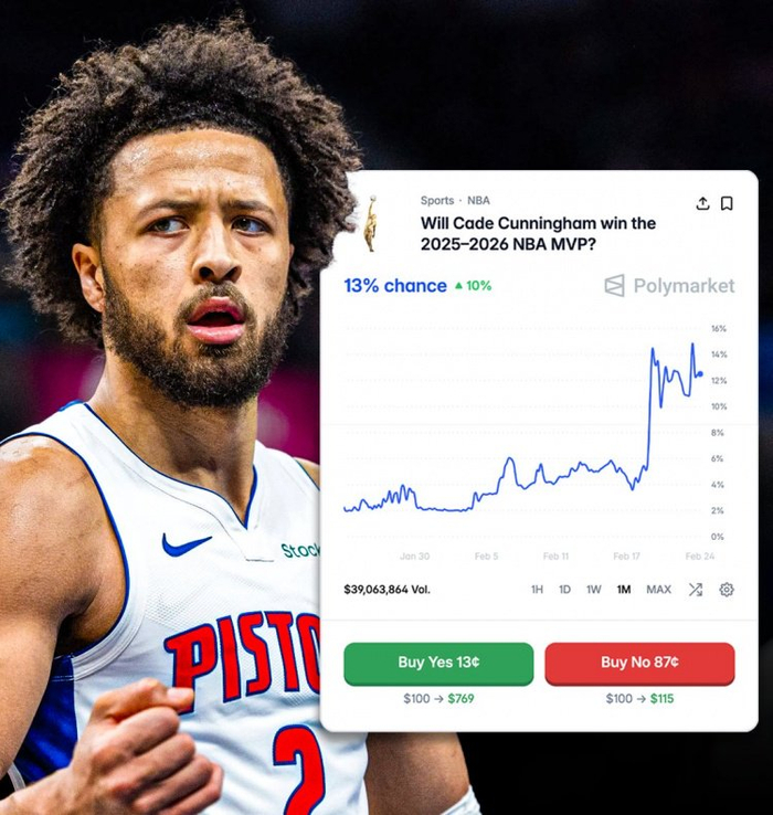 直播吧2月25日讯 体育预测平台Polymarket数据显示,坎宁安他的MVP概率在过去一周里已经翻了4倍,来到13%概率。